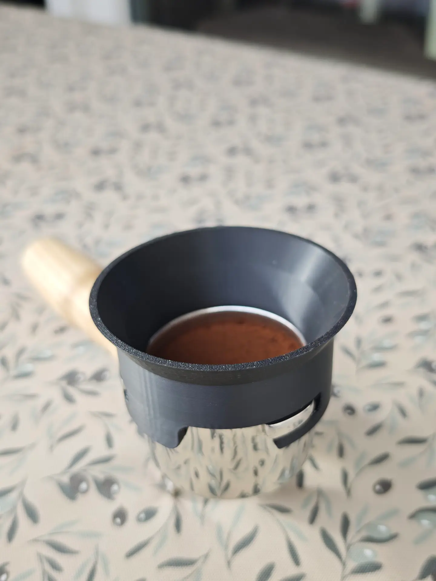 Im Gegensatz zu herkömmlichen Magnet-Modellen blockiert dieser Trichter den Tamper nicht durch innenliegende Kanten. Mein Design setzt außen auf den drei Verschlusslaschen des Siebträgers an, wodurch der Innenraum komplett frei bleibt.